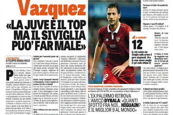 L'edizione odierna de "La Gazzetta dello Sport" ha realizzato una lunga intervista a Franco Vazquez in vista al match di...