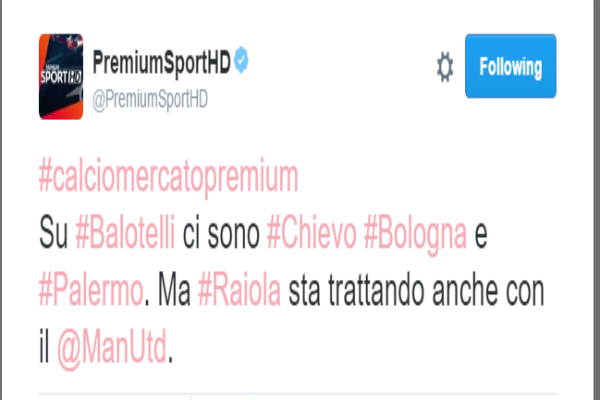 Con questo tweet di pochi minuti fa, la pagina Twitter di "Mediaset Premium" scrive del caso Balotelli, cercato da alcuni...