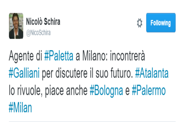 Con questo post sul proprio profilo "Twitter", il noto giornalista Nicolò Schira annuncia di un possibile interessamento da parte del Palermo...