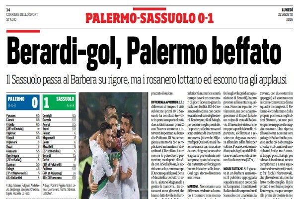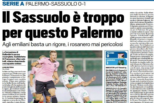 L'edizione odierna di "Tuttosport" ha stilato le pagelle dei rosanero dopo il match perso ieri contro il Sassuolo. Di seguito...