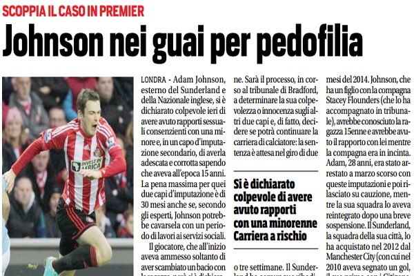 "Adam Johnson, esterno del Sunderland e della Nazionale inglese, si è dichiarato colpevole ieri di avere avuto rapporti sessuali consenzienti...