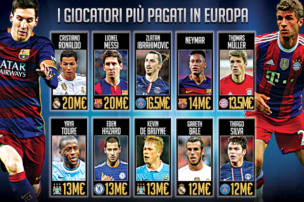 Con il rinnovo del contratto di Thomas Müller – che prenderà 13,5 milioni di euro netti a stagione – il Bayern Monaco ha stabilito il proprio record in fatto di stipendio riconosciuto ad un singolo giocatore. Il fuoriclasse tedesco entra così nella top ten dei calciatori più pagati secondo le notizie disponibili in questo momento, a fine 2015, piazzandosi al quinto posto dietro Leo Messi, Cristiano Ronaldo, Ibrahimovic e Neymar. Secondo le ultime informazioni disponibili i due fuoriclasse di Barcellona e Real Madrid concludono l’anno con 20 milioni di euro a testa di ingaggio netto percepito dai rispettivi club davanti a Ibrahimovic del Paris Saint Germain a 16,5 milioni di euro. Curiosamente per tutti e tre il 2016 potrebbe essere un anno di svolta. Ma se per i primi due un eventuale trasferimento lontano dagli attuali club significherebbe con molta probabilità un incremento del proprio ingaggio (Messi e CR7 sono stati accostato soprattutto ai due club di Manchester, con il City sull’argentino e lo United interessato ad un clamoroso ritorno del portoghes), per il campione svedese a fine anno l’addio al PSG potrebbe significare anche la fine dei faraonici ingaggi in vista di un passaggio altrove, molto probabilmente negli USA dove la Major League lo accoglierebbe a braccia aperte, ma con un ingaggio ben diverso dall’attuale. Per il resto nella graduatoria figurano tutti i giocatori più importanti del panorama mondiale e tutti i principali candidati al Pallone d’oro. Nella classifica qui sotto, naturalmente, a salire è proprio il tedesco Thomas Müller. Da ricordare che qui non figura Angel Di Maria (11 milioni l’anno) visto che non era candidato al Pallone d’oro ma che per dovere di cronaca va citato così come Wayne Rooney (11,5 milioni l’anno) che sono rispettivamente undicesimo e dodicesimo nella classifica dei giocatori più pagati. In generale l’impressione è che la corsa al rialzo sia solo iniziata e che presto a questi nomi se ne possano aggiungere altri. Il mercato estivo potrebbe riservare grandi sorprese e il terremoto in atto nel mercato allenatori lascia supporre che i grandi club vogliano presto portare alla corte dei loro nuovi manager giocatori all’altezza di programmi ambiziosi e possibilmente vincenti.