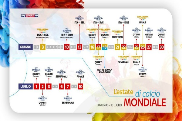 Sarà un’estate piena di calcio quella che si appresta ad iniziare. Tutte le partite degli Europei di Francia e della Coppa America verranno trasmesse da Sky Sport, a partire dal 3 Giugno. Di seguito l’elenco completo del programma stilato dall’emittente satellitare e riportato da “digital-news.it”. Nella lista sono evidenziate le partite visibili SOLO su Sky Sport: per Euro 2016 ben 20 della fase a gironi e 4 ottavi di finale, mentre per la Copa America sono TUTTE in esclusiva Sky.