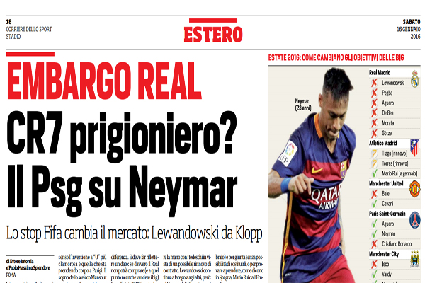 “Il tempo dirà se alla fine avrà avuto ragione il vecchio Arsene Wenger, l’unico a dirsi scettico sull’embargo al mercato di Real e Atletico per l’intera stagione 2016-17 al grido di «vedrete, ci saranno i ricorsi e riusciranno a fare acquisti in estate». La sanzione però oggi c’è e le big d’Europa stanno già ritoccando le strategie per i grandi colpi dell’estate: sanno che la Fifa ha tolto di mezzo una concorrente potentissima (il Real, ovviamente, perché l’Atletico fa poco testo) ma sanno soprattutto che certi sogni di mercato resteranno tali ancora a lungo. Perché, stranamente, tutti guardavano in casa Real, pronti anche ad approfittare dell’ennesima rivoluzione in panchina: non potendo rimpiazzare le proprie stelle, però, i Galacticos non possono permettersi alcuna cessione cellente. Da CR7 a Neymar. E in questo senso l’inversione a “U” più clamorosa è quella che sta prendendo corpo a Parigi. Il sogno dello sceicco Mansour era piazzare il colpo del secolo: Cristiano Ronaldo al Psg. Potrebbe virare – ne sono sicuri in Francia – sul brasiliano Neymar, che certamente rappresenterebbe anche un investimento più a lungo termine. Sullo sfondo, una triangolazione via Qatar: lo sceicco controlla il Psg ma sponsorizza anche il Barça con la compagnia di bandiera. Quindi nessuno sgarbo: solo una maxi operazione ben orchestrata. Tra Neymar e CR7, calcisticamente, rischia di passare quasi una generazione pur essendoci “appena” 7 anni di differenza. E deve far riflettere un dato: se davvero il Real non potrà comprare (e a quel punto neanche vendere i big) fino all’estate 2017, il portoghese resterà prigioniero a Madrid fino ai 32 anni. A quel punto, accetterebbe una nuova sfida in Europa o si lascerebbe tentare dalle lusinghe delle nuove frontiere, tipo Mls? Di certo al Psg interessa anche Aguero, uno che era sulla lista della spesa del Real… Lewandowski. Con il Real fuori gioco, qualcuno può tirare un sospiro di sollievo. La Juve (per ora) su Pogba e certamente su Morata, visto che a Madrid non potrebbero dare un seguito alla clausola di “recompra”. Ma Alvaro è finito subito sulla lista di altri club che avrebbero via libera senza Florentino Perez di mezzo: l’Arsenal, per esempio. Certo il Bayern non può dirsi sicuro di riuscire a trattenere Lewandowski, il cui manager era stato più volte a Madrid e senza troppa discrezione, quantomeno per forzare la mano con i tedeschi in vista di un possibile rinnovo di contratto. Lewandowski continua a fare gola agli altri, però: al Liverpool di Klopp innanzi tutto, dove ritroverebbe il tecnico che lo ha lanciato al Borussia Dortmund, e al Chelsea. Ciao Simeone. I Blues potrebbero avvantaggiarsi almeno su un fronte, quello della panchina: senza poter comprare, riuscirà davvero l’Atletico Madrid a trattenere il Cholo Simeone? Difficile, e per Abramovich potrebbe essere la consolazione rispetto a una gamma di grandi obiettivi a cui rinunciare, tutti di sponda Real però: Bale, Kroos, forse pure lo stesso CR7, nome appena sussurrato dalle parti di Stamford Bridge. L’Atletico non aveva grandi colpi in mente per l’estate. E ora deve sfruttare quel che resta della sessione di gennaio per depositare due rinnovi, quelli di Tiago e di Fernando Torres, che altrimenti perderebbe gratis (possono già trattare e poi firmare da febbraio) e per giunta senza possibilità di sostituirli, o per provare a prendere, come dicono in Spagna, Mario Rui dall’Empoli. Da Bale a Cavani. L’ossessione dello United – al di là dell’idea romantinca di un ritorno di CR7 – era riportare in Premier League quel Bale che piace anche al Chelsea, confidando anche nelle nuove strategie di mercato legate dell’era Zidane. Potrà concentrare le risorse su Cavani, vecchio pallino anche dell’Arsenal. Via il Real, per Götze si sfidano Barcellona e Liverpool, mentre il City – che sogna Vardy e Marquinhos – dovrà solo rinunciare all’obiettivo Isco (c’era la Juve). Una sola variabile potrebbe stravolgere questo scenario, prima ancora del ricorso del Real: una folle corsa di Florentino Perez per anticipare, da qui all’1 febbraio, almeno un grandissimo colpo. Ma quale di queste stelle rinuncerebbe alla Champions?! Questo quanto scrive l’edizione odierna de “Il Corriere dello Sport”,