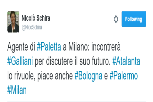 Con questo post sul proprio profilo “Twitter”, il noto giornalista Nicolò Schira annuncia di un possibile interessamento da parte del Palermo sul difensore centrale del Milan Gebriel Paletta. Sul centrale, però, non c’è solo l’interessamento del club rosanero, ma anche quello di Atalanta e Bologna. Ecco cosa scrive Schira: “Agente di Paletta a Milano: incontrerà Galliani per discutere il suo futuro. Atalanta lo rivuole, piace anche Bologna e Palermo”. In alto la foto in questione.