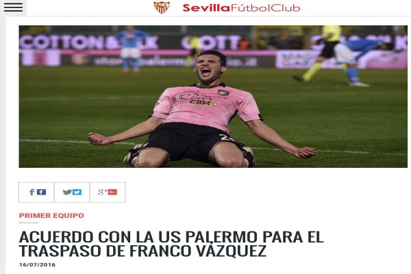 Ecco quanto riporta il sito ufficiale del Siviglia su Franco Vazquez e sulla possibilità di scendere in campo con il club spagnolo: “Il Siviglia FC e il Palermo calcio hanno raggiunto un accordo provvisorio per il centrocampista argentino Franco Vazquez , 27anni, che diventerà un giocatore del Siviglia per le prossime 5 stagioni. In attesa della firma dei contratti, il Siviglia FC ha ottenuto il permesso dal suo club di origine per lo spostamento dello stesso a Orlando, dove è arrivato ieri pomeriggio alle ore 18.00 ora locale, in Florida“. In alto la foto del comunicato.
