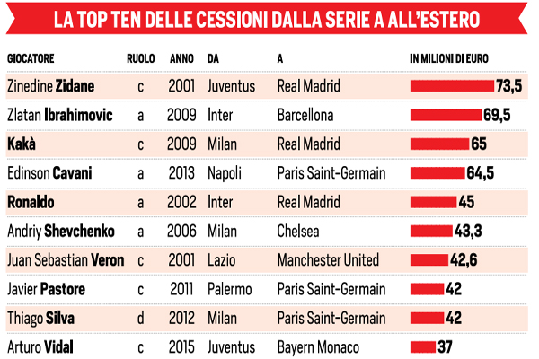 L’edizione odierna de “Il Corriere dello Sport” fa il punto sul mercato delle squadre di serie A: “A Manchester pronti a investire 50 milioni sul brasiliano Una proposta simile sarebbe irrinunciabile per la Lazio. Quella che da molti è stata accolta come un’offerta incredibile, potrebbe rappresentare il primo vero “colpo” invernale del calciomercato italiano, almeno in uscita. La top ten delle cessioni dalla Serie A all’estero vanta, infatti, quattro operazioni per cifre maggiori di 50 milioni di euro, ma i movimenti sono tutti avvenuti nelle sessioni estive. Da Zidane a Cavani. La Juventus ha il primato della cessione più costosa, avendo ricavato circa 142 miliardi di lire (73, 5 milioni di euro) dalla vendita di Zidane al Real Madrid, nell’agosto del 2001. In ordine di prezzo segue il passaggio di Ibrahimovic dall’Inter al Barcellona nel luglio del 2009, costato agli spagnoli ben 69, 5 milioni. Il bronzo se lo aggiudica Kakà, che nello stesso mese e nello stesso anno di Ibrahimovic lasciò l’Italia ed il Milan per accasarsi al Real Madrid per 65 milioni. Sopra la soglia dei 50 milioni anche la cessione di Cavani dal Napoli al Paris Saint-Germain nel luglio del 2013, per 64, 5 milioni. Real Madrid e Psg sono i “Paperoni” di questa classifica con tre acquisti a testa, mentre il Milan fa il “Gastone”, incasando 150 milioni da tre cessioni. gli altri 6. Da 45 a 37 milioni sfilano gli altri campioni che hanno incantato in Italia prima di mettere in valigia tecnica e prestazioni: Ronaldo “il fenomeno” dell’Inter, Shevchenko il bomber rossonero, Veron il duro della Lazio, Thiago Silva il muro del Milan e Vidal il guerriero della Juventus. E Anderson?”