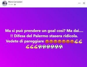 È un Moris Carrozzieri furioso quello che sui social commenta live la gara che il Palermo sta perdendo contro la Ternana. L’ex difensore rosanero, infatti, commentando il secondo gol subito dalla retroguardia siciliana ha scritto: