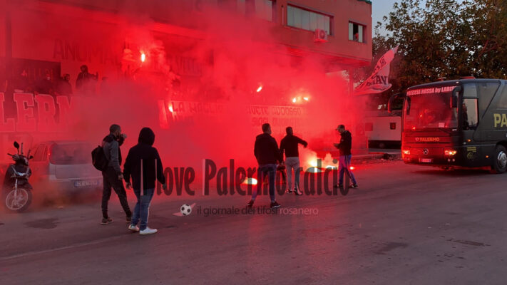 Il gruppo del tifo organizzato, che fin qui è sempre stato critico nei confronti della società, ha voluto dimostrare la propria vicinanza alla “maglia rosanero” e questo pomeriggio, poco prima della partenza, si è radunato al centro sociale Anomalia, dove la squadra è arrivata in pullman e ha ricevuto cori di incitamento accompagnati da fumogeni.