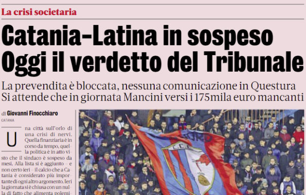 Una città sull’orlo di una crisi di nervi. Quella finanziaria è in corso da tempo, quella politica è in atto visto che il sindaco è sospeso da mesi. Alla lista si è aggiunto il calcio che a Catania è considerato più importante di ogni altro argomento. Ieri la giornata si è chiusa con un nulla di fatto che alimenta problematiche e timori: il match con il Latina, in programma allo stadio Massimino, fino a ieri sera è rimasta una gara in sospeso in attesa di segnali dal Palazzo di Giustizia.