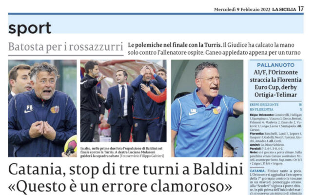 La Sicilia: “Catania, stop di tre turni a Baldini: «Questo è un errore clamoroso»”