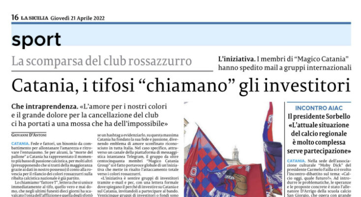 Come riporta oggi “La Sicilia” i membri del gruppo Magico Catania Group hanno annunciato sui social, l’avvio di una iniziativa. In pratica è stato chiesto un aiuto, quasi disperato, a numerosi investitori italiani, proprietari di aziende prestigiose, e fondi esteri che sono stati contattati via e-mail. L’intento è quello, come spiegano in una nota, di invitarli a prendere il Catania.