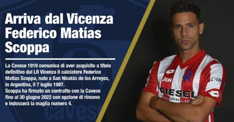 “La Cavese 1919 comunica di aver acquisito a titolo definitivo dalla società LR Vicenza il calciatore Federico Matías Scoppa, nato a San Nicolás de los Arroyos in Argentina il 7 luglio 1987.