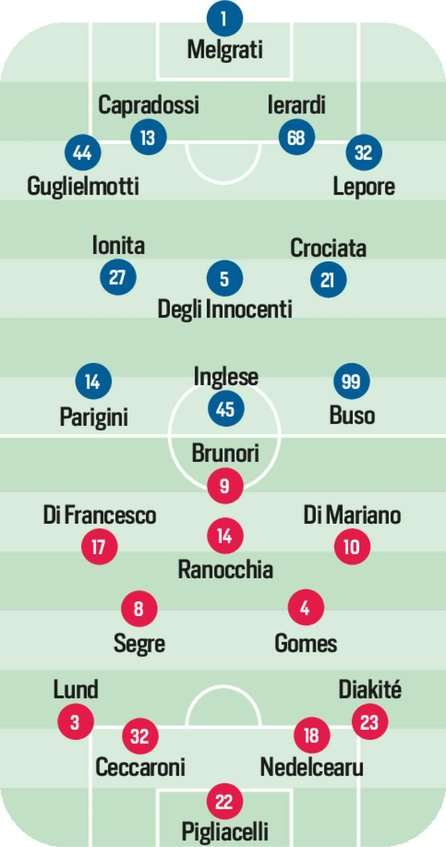 All.: Corini . A disp.: 1 Desplanches, 13 Kanuric, 2 Graves, 25 Buttaro, 31 Aurelio, 20 Vasic, 53 Henderson, 80 Coulibaly, 7 Mancuso, 11 Insigne, 27 Soleri, 70 Traorè. Indisp.: Lucioni. Squal.: Marconi. Diff.: Coulibaly, Lucioni, Di Mariano, Segre, Nedelcearu. Ultime: Ranocchia torna titolare.