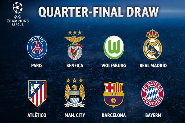 Continua il cammino della Uefa Champions League, senza italiane. Ecco i sorteggi dei quarti di finale che vede come protagonista in assoluto la Spagna con Barcellona, Real Madrid ed Atletico Madrid, con due squadre la Germania con Bayern Monaco e Wolfsburg, prima volta ai quarti, e completano il quadro generale Manchester City, Benfica e Paris Saint Germain. Le gare di andata verranno disputate il 5 e il 6 Aprile e il ritorno il 12 e il 13 Aprile. Di seguito gli accoppiamenti: