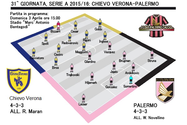 ULTIME CHIEVO: Maran ospiterà i rosanero con il suo consueto 4-3-3. Il tecnico clivense dovrà fare a meno dello squalificato Hetemaj e degli infortunati Dainelli e Gamberini. Per far fronte alla squadra di Novellino, l’ex Catania si affiderà a Bizzarri tra i pali; linea difensiva a quattro composta da Cacciatore, Spolli, Cesar e Gobbi, quest’ultimo favorito su Frey; la mediana vedrà in cabina di regia Radovanovic affiancato dall’ rosa Nicola Rigoni e Castro; il trio d’attacco invece sarà composto da Birsa, Meggiorini e Inglese, che potrebbe vincere il ballottaggio con Floro Flores.