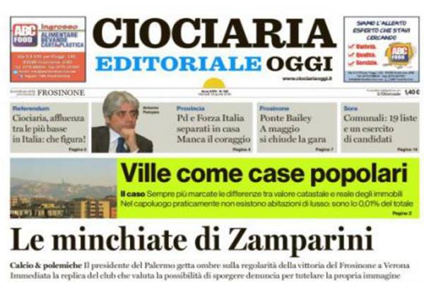 L’edizione odierna del quotidiano “Ciociaria” non le manda a dire a Maurizio Zamparini. Dopo le accuse alzate dal patron rosanero circa la dubbia veridicità del gol del Frosinone contro il Verona, e in prima pagina scrive: “Ecco l’ultima minchiata di Zamparini. Il presidente del Palermo ha messo in dubbio la veridicità della vittoria canarina sul Verona”.