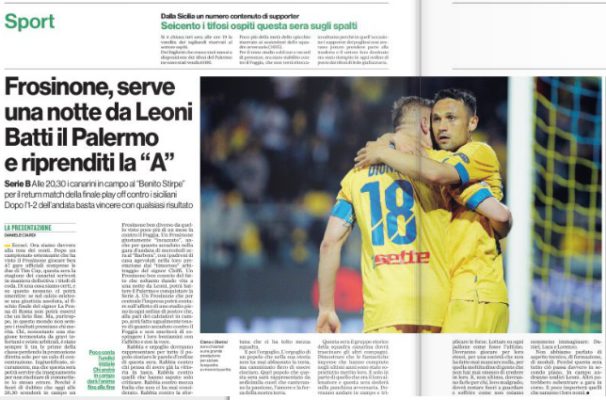 “Eccoci. Ora siamo davvero alla resa dei conti. Dopo un campionato estenuante che ha visto il Frosinone giocare ben 47 gate ufficiali comprese le due di Tim Cup, questa sera la stagione dei canarini scriverà, in maniera definitiva i titoli di coda. Di una cosa siamo certi, e su questo nessuno ci potrà smentire: se nel calcio esistesse una giustizia assoluta, al fischio finale del signor La Penna di Roma non potrà esserci che un lieto fine. Ma, purtroppo, in questo mondo non sempre i risultati premiano chi merita. Chi, nonostante una stagione tormentata da gravi infortuni e sviste arbitrali, è stato sempre lì tra le prime della classe perdendo la promozione diretta solo per un calo di concentrazione. Ingiustificato, sicuramente, ma che questa sera potrà, servire da insegnamento per non rischiare di commettere lo stesso errore. […]. Un Frosinone ben conscio del fatto che soltanto dando vita a una notte da Leoni, potrà, battere il Palermo e conquistare la Serie A. Un Frosinone che per centrale l’impresa potra, contare sull’affetto di uno stadio pieno in ogni ordine di posto e che, alla pari dei calciatori in campo, avrà fatto ugualmente tesoro di quanto accaduto contro il Foggia e non smettera di sospingere i loro beniamini con l’affetto e con la voce. […]”. Questo quanto riportato dall’edizione odierna di “Ciociaria Oggi”.