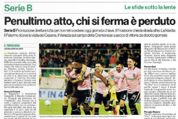 L’edizione odierna di “Ciociaria Oggi” ha analizzato la penultima giornata di serie B, cruciale sia per la lotta promozione che per la lotta salvezza. Ecco un estratto: “Penultimo capitolo dell’avvincente romanzo della serie B. Ieri sera l’anticipo Avellino-Spezia, oggi alle 15 le altre dieci gare. Riflettori puntati sulla corsa alla seconda promozione diretta. Una volata che vede in lizza Frosinone, Palermo, Parma, Venezia e Bari. E il verdetto potrebbe arrivare già’ questa sera con i canarini in serie A se vinceranno ma nel contempo il Palermo dovrebbe perdere e Parma e Venezia non andare oltre il pari. Ma sarà una giornata fondamentale anche per la lotta alla salvezza. […]”