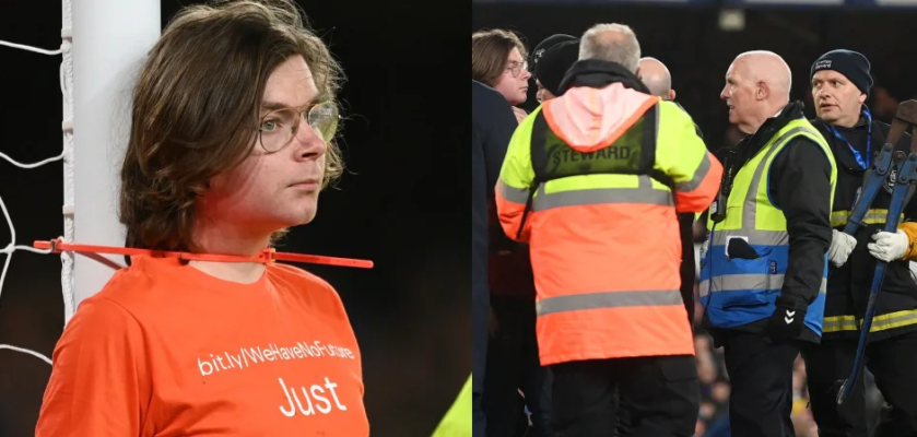 Succede tutto nel corso del secondo tempo, quando un tifoso ha invaso il campo di gioco e ne ha approfittato per legarsi al palo della porta… per il collo. Il gesto ha fatto intervenire la sicurezza di Goodison Park, che ha impegato ben otto minuti per liberare il giovane manifestante.