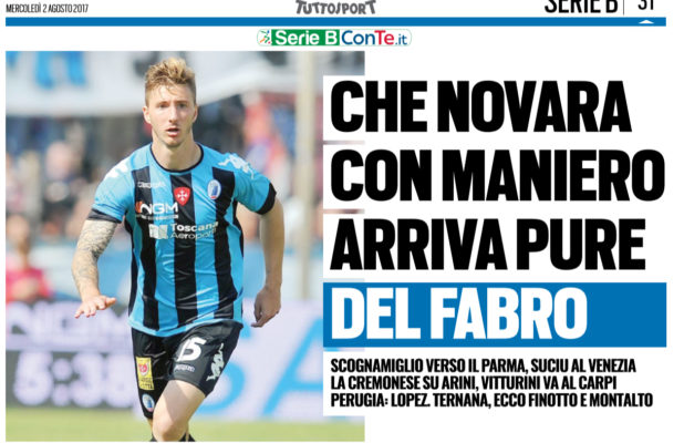 “Scatto del Novara che nelle prossime ore definirà tre trattative, due in entrata e una in uscita che cambieranno volto alla squadra. Arriverà l’ufficialità per il centravanti Riccardo Maniero (‘87), affare definito già da tempo, per l’ormai ex attaccante del Bari un contratto triennale. Arriva anche, in difesa, il promettente Dario Del Fabro (‘95), che la Juve ha appena acquistato dal Cagliari per girarlo in prestito al Novara. Prenderà il posto di Gennaro Scognamiglio (‘87) di cui si sta definendo la cessione: su di lui ci sono Parma (in vantaggio) e Salernitana.