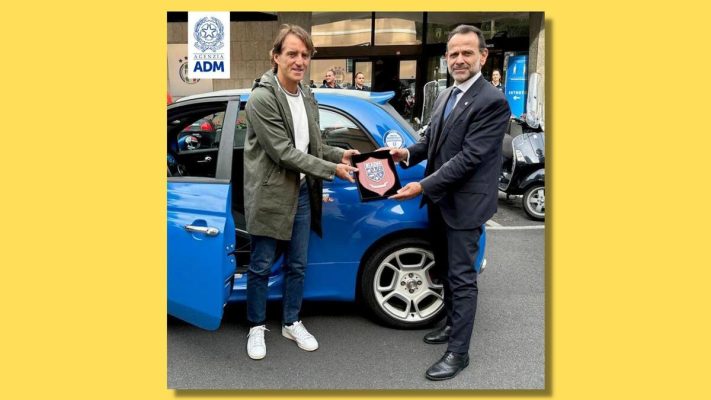 Il tecnico dell’Italia Roberto Mancini è stato protagonista della consegna da parte del direttore Generale di ADM (Agenzia Dogane e Monopoli) Marcello Mienna, di un’auto confiscata al narcotraffico. La vettura in questione è una Fiat 500 Abarth di colore azzurro, proprio come azzurri sono i colori della nazionale italiana che lo stesso Mancini allena. Un gesto simbolico, oltre che una conferma della partnership fra ADM e FIGC, mossa da principi di legalità, tutela della saluto e della pratica dello sport.