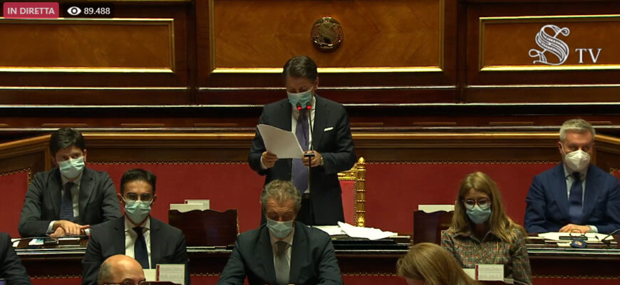 Il Premier Giuseppe Conte ha preso la parola al Senato per la discussione in vista del Dpcm.