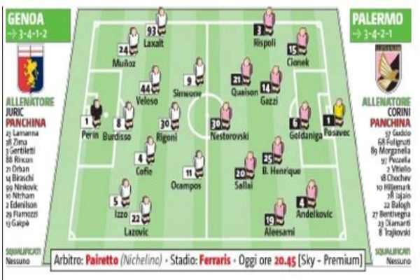Questa sera alle 20.45 il Palermo affronterà il Genoa al “Luigi Ferraris”, in occasione della 17^ giornata del campionato di serie A. Viatico fondamentale per i rosanero che provengono da nove sconfitte di fila, mentre i liguri navigano in acque tranquille avendo totalizzato fin qui 23 punti. Ecco le probabili formazioni dell’edizione odierna de “Il Giornale di Sicilia”: