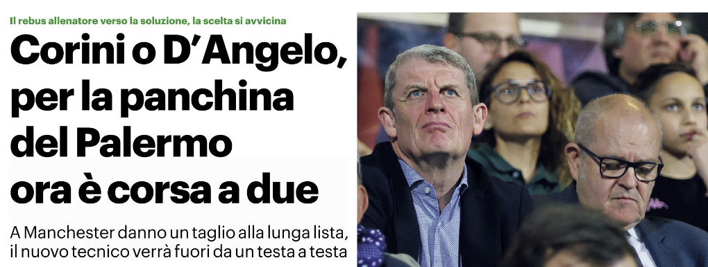 Il cerchio si stringe. Per la panchina del Palermo, ormai, è una corsa a due. Corini o D’Angelo, con tutto il resto del listone staccato. Resta spazio per un possibile terzo incomodo, ma solo nel caso in cui le valutazioni finali sui due contendenti non dovessero portare ad un accordo definitivo. Perché quello, ancora, non c’è. Ci sono trattative portate avanti, ci sono analisi da completare e per come si sta protraendo questa vicenda, è chiaro che sull’asse Palermo-Manchester si preferisca spendere un giorno in più, pur di ridurre il margine d’errore.