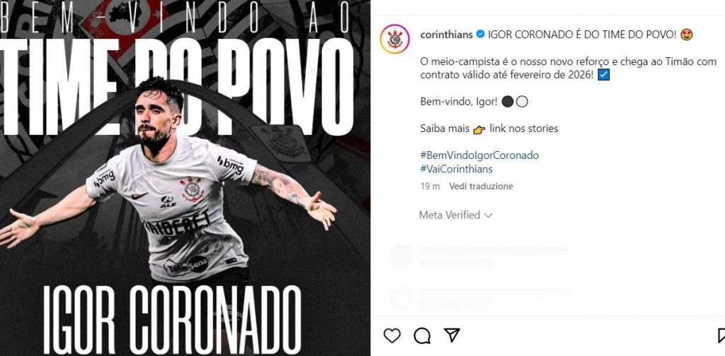 Igor Coronado è un nuovo giocatore del Corinthians. L’ex giocatore del Palermo arriva a parametro zero e la sua firma viene annunciata dal club brasiliano attraverso i propri canali ufficiali: