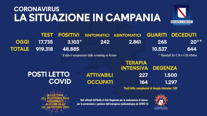 Rispetto alla giornata precedente sono stati registrati 3.103 casi positivi, 20 decessi e 265 guarigioni/dimissioni, che portano il totale complessivo dall’inizio della pandemia nel territorio regionale a 48.885 contagi, 644 morti e 10.537 guariti.