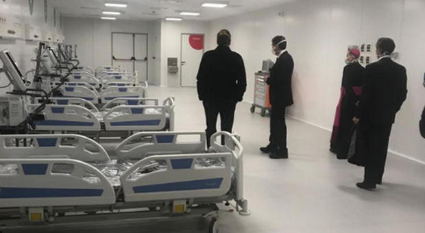 Un momento della visita dell'arcivescovo di Milano, monsignor Mario Delpini, ai padiglioni della Fiera di Milano in cui è stato allestito l'ospedale per fronteggiare l'emergenza legata al Coronavirus, Milano, 30 marzo 2020. ANSA/DIOCESI DI MILANO ++ NO SALES, EDITORIAL USE ONLY ++