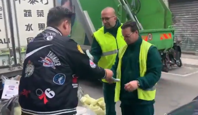 Coronavirus: impiegato ambasciata cinese regala mascherine a due operatori ecologici a Milano (VIDEO)