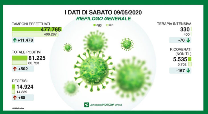 Ancora un lieve calo del numero dei decessi secondo l’ultimo bollettino della Regione Lombardia sul Coronavirus: nella regione, rispetto a ieri, il numero di morti giornaliere è di 85, dunque in diminuzione rispetto ai 94 decessi registrati l’8 maggio. Il numero complessivo di decessi ha raggiunto quota 14.924. I casi positivi sono +502 per un totale di 81.225. Gli attualmente positivi sono 30.262. I dati arrivano a fronte di 11.478 nuovi tamponi eseguiti, mentre i casi testati in totale sono 282.817. Il numero dei pazienti in terapia intensiva è di 330 (-70 nelle ultime 24 ore). I ricoverati sono 5.535 (-167). Sono invece 36.039 i guariti.
