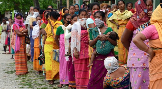 epa08374610 Indian Bodo tribal women wait for their turn to collect 500 Indian Rupees (around seven US dollar) from a bank's customer service point under Indias welfare scheme in the Baksa district of Assam, India, 21 April 2020. India is currently under lockdown to stem the widespread of the SARS-CoV-2 coronavirus which causes the COVID-19 disease. EPA/STR