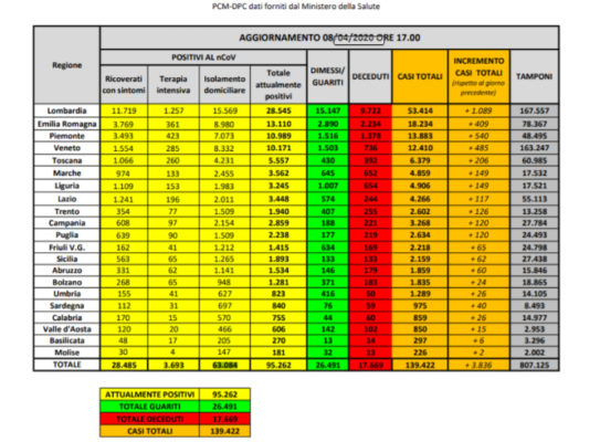 Come di consueto alle 18:00 Angelo Borrelli ha fornito il bilancio dei dati relativi a casi, morti e guariti di coronavirus verificatisi dall’inizio dell’epidemia all’8 aprile 2020. Rispetto alla giornata precedente vi sono state 3.836 persone diagnosticate positive in più, 542 nuove vittime e 2.099 guariti, il numero più alto dallo scoppio dell’emergenza. L’incremento delle persone attualmente positive è dunque pari a 1.195.