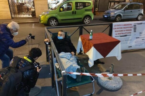 Salvatore Chiarello, titolare di un bar di Torino, da ieri è incatenato al dehors del suo locale per protesta contro il governo dopo l’ingiunzione di un avvocato che gli intima di pagare due mesi arretrati d’affitto.