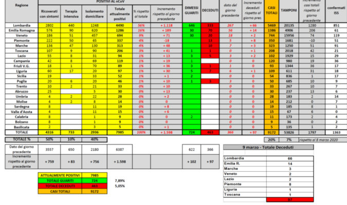 La Protezione Civile ha fornito l’ormai consueto aggiornamento sull’epidemia da coronavirus in Italia. L’ultimo bollettino ufficiale comunicato da Angelo Borrelli, capo della Protezione Civile, parla di 463 vittime totali: 97 nuovi decessi. Il numero di persone contagiate sale a 9172, 1797 casi in più rispetto a ieri, 8 marzo. Mentre le persone attualmente positive sono 7985.Quanto alle guarigioni, dall’inizio dell’emergenza, sono state 724 (+102). Durante la conferenza stampa è stato reso noto che sono stati chiusi gli impianti sciistici in tutta Italia.