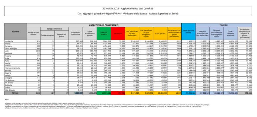Si contano 93 nuove vittime legate al Covid nelle ultime 24 ore. Nella giornata di ieri, lo stesso dato era stato pari a 85 e il giorno prima ancora, il 18 marzo, a 165 morti. Complessivamente, dall’inizio dell’emergenza sanitaria si contano 157.785 decessi confermati (fino a ieri: 157.692). Sul fronte delle nuove infezioni, stando all’ultimo bollettino diffuso come di consueto dal ministero della Salute e dalla Protezione civile, sono stati confermati 60.415 nuovi contagi da Coronavirus, dato che porta il totale degli attualmente positivi a quota 1.172.824. Ieri i nuovi casi erano invece stati 48.385. Il totale dei casi dopo due anni e oltre di pandemia è ormai arrivato a quota: 13.861.743 (ieri: 13.800.179).