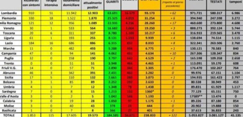 Rispetto alle guarigioni, in un giorno sono guariti 1.159 pazienti (ieri erano risultati negativi al test in 533). Complessivamente sono 184.585 le guarigioni registrate in Italia dall’inizio della diffusione del virus. I ricoverati con sintomi in ospedale sono ancora 1.853 (ieri erano 2.038). I pazienti più gravi, in terapia intensiva, sono invece 115 (ieri erano 127).