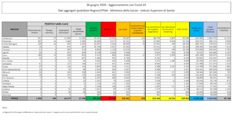 Come di consueto, intorno alle ore 18 il Ministero della Salute ha reso noto il bilancio dell’emergenza coronavirus aggiornato a venerdì 26 giugno. Rispetto alla giornata precedente sono stati registrati 259 casi positivi, 30 decessi e 890 guarigioni/dimissioni, che portano il totale il totale complessivo dell’emergenza dall’inizio della pandemia in tutta Italia a 239.961 contagi, 34.708 vittime e 187.615 guariti.