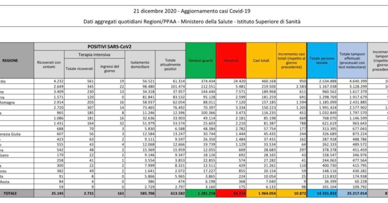 Come di consueto il ministero della Salute, di concerto con l’Istituto Superiore di Sanità e le amministrazioni delle singole regioni, ha diramato il bilancio dell’emergenza coronavirus aggiornato a lunedì 21 dicembre.