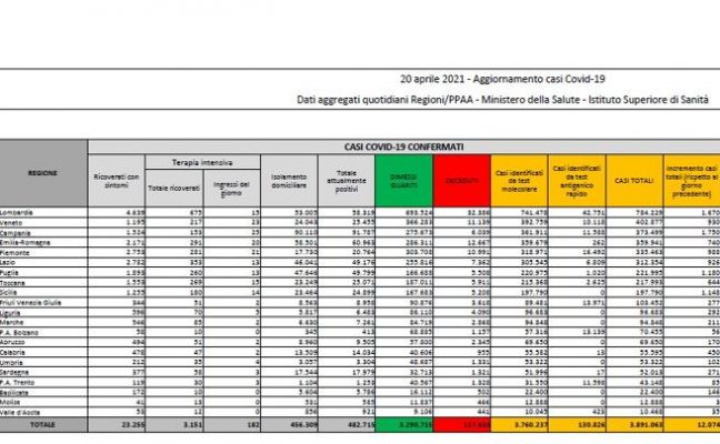 Più contagi in 24 ore rispetto a ieri, a fronte di più tamponi. E il rapporto di casi su test scende al 4,1% dal 6% di lunedì. Dal confronto con lo scorso martedì (13 aprile), quando sono stati registrati +13.447 casi con un tasso di positività del 4,4%, si vede un miglioramento dello scenario. La discesa della curva è lenta. Ci vogliono tempo e pazienza per arrivare a zero positivi. Non sappiamo quando finirà l’emergenza, ha ricordato il premier Mario Draghi, in un videomessaggio introduttivo ai lavori del webinar di ascolto con i rappresentanti della società civile in vista del Global Health Summit del 21 maggio a Roma, ma «con i vaccini abbiamo la possibilità di porre fine alla pandemia».