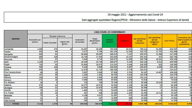 Sono 3.937 i nuovi casi di coronavirus in Italia (ieri sono stati +3.224, qui il bollettino). Sale così ad almeno 4.201.827 il numero di persone che hanno contratto il virus Sars-CoV-2 (compresi guariti e morti) dall’inizio dell’epidemia. I decessi odierni sono 121 (ieri sono stati +166), per un totale di 125.622 vittime da febbraio 2020. Le persone guarite o dimesse sono complessivamente 3.816.176 e 11.930 quelle uscite oggi dall’incubo Covid (ieri +11.348). Gli attuali positivi — i soggetti che hanno il virus — risultano essere in tutto 260.029, pari a -8.116* rispetto a ieri (-8.294 il giorno prima), in calo dal 6 aprile con l’unica eccezione del 2 maggio.
