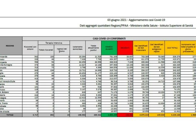 Sono 1.968 i nuovi casi di coronavirus in Italia (ieri sono stati +2.897, qui il bollettino). Sale così ad almeno 4.225.163 il numero di persone che hanno contratto il virus Sars-CoV-2 (compresi guariti e morti) dall’inizio dell’epidemia. I decessi odierni sono 59 (ieri sono stati +62), per un totale di 126.342 vittime da febbraio 2020. Le persone guarite o dimesse sono complessivamente 3.893.259 e 6.392 quelle uscite oggi dall’incubo Covid (ieri +18.535). Gli attuali positivi — i soggetti che hanno il virus — risultano essere in tutto 205.562, pari a -4.488* rispetto a ieri (-15.701 il giorno prima), in calo dal 6 aprile con l’unica eccezione del 2 maggio.