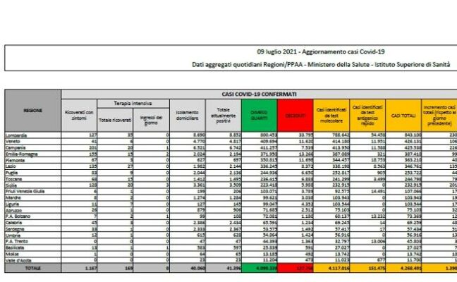 A quanto si apprende, gli Attuali positivi sono 41.396 (- 73), i Dimessi/Guariti 4.099.339 (+ 1.434), i Deceduti 127.756 (+ 25) mentre il totale casi è di 4.268.491 (+ 1.390).