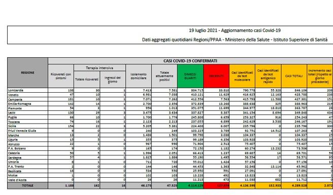 Sono 2.072 i nuovi casi di coronavirus in Italia (ieri sono stati 3.127, qui il bollettino). Sale così ad almeno 4.289.528 il numero di persone che hanno contratto il virus Sars-CoV-2 (compresi guariti e morti) dall’inizio dell’epidemia. I decessi odierni sono 7 (ieri sono stati 3), per un totale di 127.874 vittime da febbraio 2020. Le persone guarite o dimesse sono complessivamente 4.114.129. e 651 quelle uscite oggi dall’incubo Covid (ieri 501). Gli attuali positivi — i soggetti che hanno il virus — risultano essere in tutto 47.525, pari a +1.412 rispetto a ieri (+2.622 il giorno prima).
