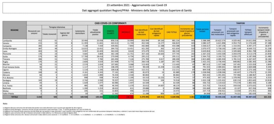 Le persone che hanno contratto il virus in Italia dall’inizio dell’epidemia sono 4.649.906. Di queste, 130.551 sono morte, mentre 4.414.272 sono guarite o sono state dimesse. L’ultimo bollettino registra 63 persone positive decedute (20 delle quali risultano da conteggi relativi ai giorni scorsi) e 4.061 nuovi casi accertati. I pazienti positivi al virus attualmente ricoverati in terapia intensiva sono 505 (8 in meno rispetto a ieri, i nuovi ingressi sono 30). I tamponi effettuati nelle ultime 24 ore sono 321.554. La Sicilia è la Regione con il maggior incremento di positivi in 24 ore: sono 647.