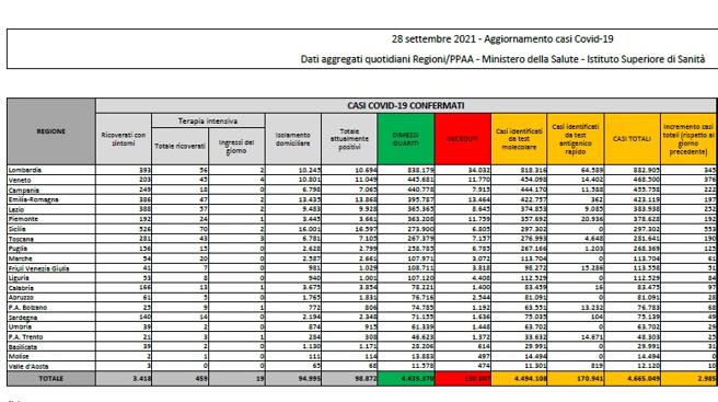 Il ministero della Salute, in collaborazione con le amministrazioni regionali e l’Istituto Superiore di Sanità, ha diramato il bilancio relativo alla pandemia da Coronavirus in Italia, aggiornato alla giornata di martedì 28 settembre 2021. Si registrano 2.985 nuovi casi, sono invece 65 le vittime registrate nelle ultime 24 ore o comunque segnalate nell’ultimo bollettino.