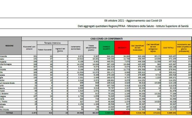 Come di consueto il ministero della Salute, di concerto con l’Istituto Superiore di Sanità e le amministrazioni delle singole regioni, ha diramato il bilancio dell’emergenza coronavirus aggiornato a mercoledì 6 ottobre. Rispetto alla giornata precedente, in cui si erano verificati 2.466 contagi, sono stati registrati 3.235 casi positivi, 39 decessi e 5.245 guarigioni/dimissioni.